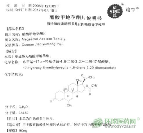 【藥品名稱】 醋酸甲地孕酮片(誼寧)