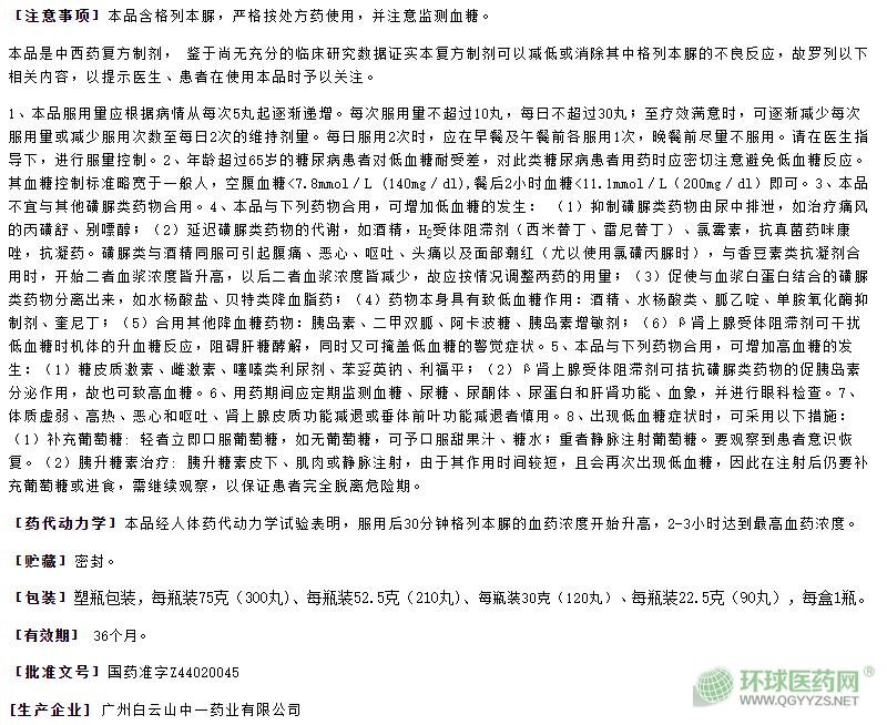 【注意事項(xiàng)】本品含格列本脲,嚴(yán)格按處方藥使用,并注意監(jiān)測(cè)血糖。本品是中西藥復(fù)方制劑,鑒于尚無(wú)充分的臨床研究數(shù)據(jù)證實(shí)本復(fù)方制劑可以減低或消除其中格列本脲的不良反應(yīng),故羅列以下相關(guān)內(nèi)容,以提示醫(yī)生、患者在使用本品時(shí)予以關(guān)注。 1.本品服用量應(yīng)根據(jù)病情從每次5丸起逐漸遞增。每次服用量不超過(guò)10丸,可逐漸減少每次服用量或減少服用次數(shù)至每日2次的維持劑量。每日服用2次時(shí),應(yīng)在早餐機(jī)午餐前各服用1次,晚餐前盡量不服用。請(qǐng)?jiān)卺t(yī)生指導(dǎo)下,進(jìn)行服量控制。 2.年齡超過(guò)65歲的糖尿病患者對(duì)低血糖耐受差,對(duì)此類糖尿病患者用藥時(shí)應(yīng)密切注意避