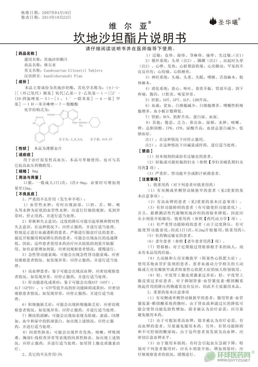 重慶圣華曦坎地沙坦酯片說明書文字版