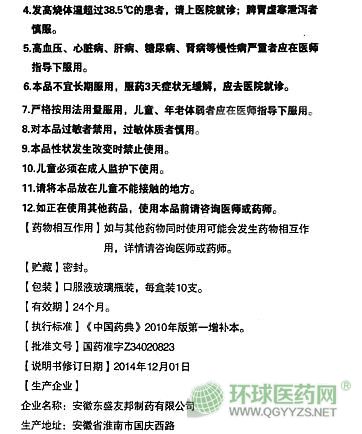 【注意事項】1.忌煙、酒及辛辣、生冷、油膩食物。 2.不宜在服藥期間同時服用滋補性中藥。 3.適用于風熱感冒癥見:發(fā)熱,微惡風,有汗,口渴,鼻流濁涕,咽喉腫痛,咳吐黃痰。 4.發(fā)高燒體溫超過38.5℃的患者,請上醫(yī)院就診;脾胃虛寒泄瀉者慎服。 5.高血壓、心臟病、肝病、糖尿病、腎病等慢性病嚴重者應在醫(yī)師指導下服用。 6.本品不宜長期服用,服藥3天癥狀無緩解,應去醫(yī)院就診。 7.嚴格按用法用量服用,兒童、年老體弱者應在醫(yī)師指導下服用。 8.對本品過敏者禁用,過敏體質者慎用。 9.本品性狀發(fā)生改變時禁止使用。 10.兒童必須在成人監(jiān)護下使用。 11.請將本品放在兒童不能接觸的地方。 12.如正在使用其他藥品,使用本品前請咨詢醫(yī)師或藥師。 13.本品在貯藏期間有少量搖之易散的沉淀。 14.臨床癥狀較重、病程較長或合并有細菌感染的患者,應加服其他治療藥物。
