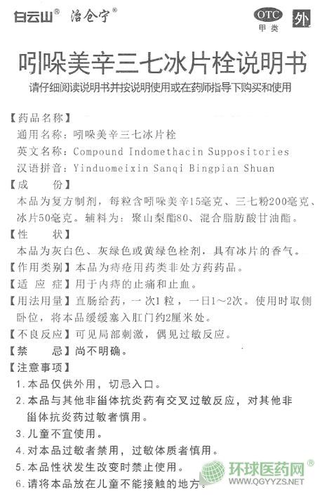 白云山吲哚美辛三七冰片栓(治倉寧)說明書文字版