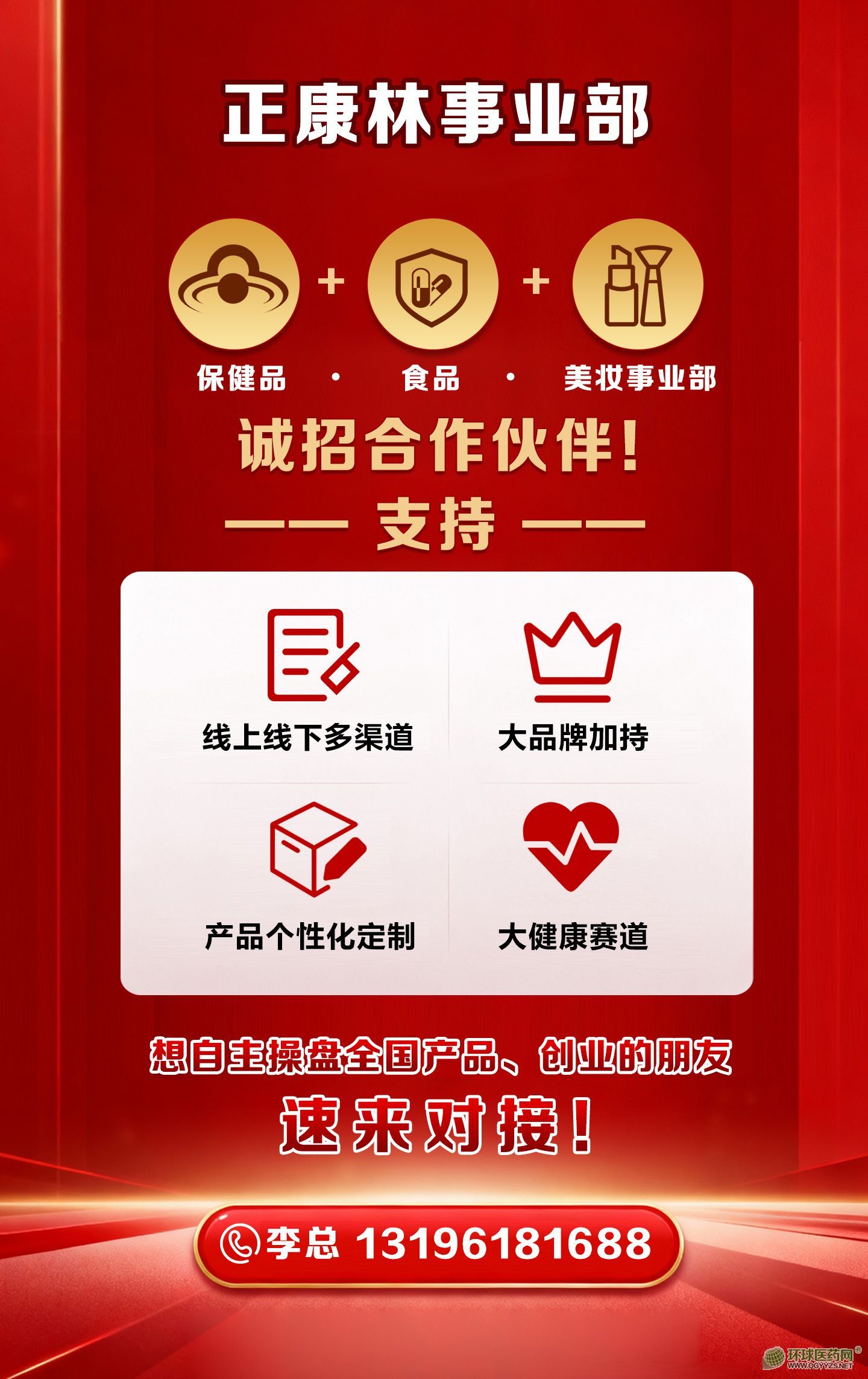 千億大健康風(fēng)口已至,機(jī)遇不等人。如果你不甘平庸,想自主操盤全國(guó)產(chǎn)品,想在大健康賽道實(shí)現(xiàn)創(chuàng)業(yè)夢(mèng)想,想收獲長(zhǎng)期穩(wěn)定的財(cái)富,就來對(duì)接正康林事業(yè)部!我們以優(yōu)質(zhì)的產(chǎn)品、強(qiáng)大的品牌、靈活的政策、完善的支持,與你攜手并肩,深耕保健品、食品、美妝三大黃金品類,搶占市場(chǎng)先機(jī),共創(chuàng)大健康產(chǎn)業(yè)的美好未來!