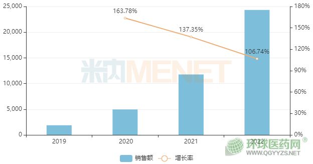 米內(nèi)網(wǎng)數(shù)據(jù)顯示,2020-2023年沙格列汀二甲雙胍緩釋片在中國三大終端六大市場的銷售額增速分別為163.78%、137.35%、106.74%,均達三位數(shù)。2022年銷售額銷售額約為2.27億元,其中城市公立醫(yī)院和縣級公立醫(yī)院銷售額為16485萬元,城市社區(qū)中心和鄉(xiāng)鎮(zhèn)衛(wèi)生院銷售額為2908萬元,城市實體藥店和網(wǎng)上藥店銷售額為3287萬元。