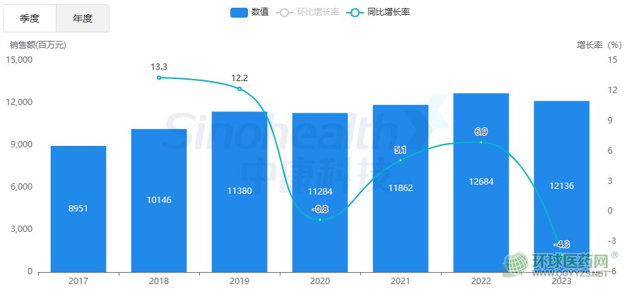 零售市場(chǎng)方面,2023年口服降糖藥的市場(chǎng)規(guī)模為121億元,同比增長(zhǎng)-4.3%。整體來看,口服降糖藥零售市場(chǎng)趨于穩(wěn)定,近6年保持100億+的銷售額。