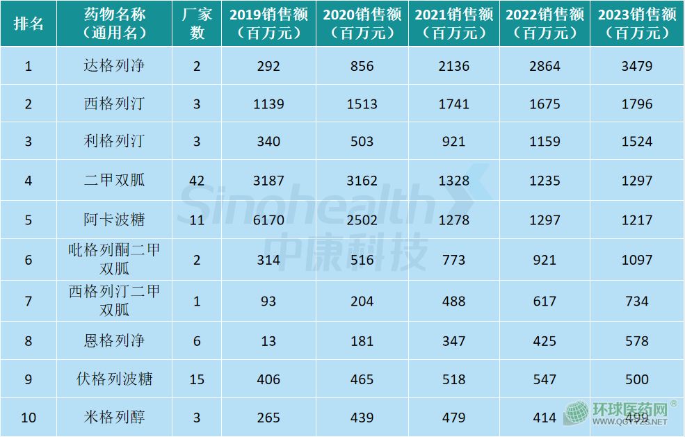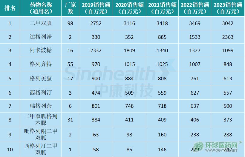 其中,有3個(gè)藥物銷售額超過了10億元。銷售額第一的是二甲雙胍,銷售額超30億元;達(dá)格列凈和阿卡波糖分別位居第二、第三,銷售額約為24億元、11億元。
