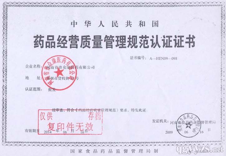 - 藥品經(jīng)營(yíng)質(zhì)量管理規(guī)范認(rèn)證證書(shū)