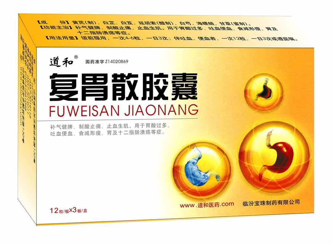 復胃散膠囊,七味地道藥材,科學配伍,脾胃同治。方中黃芪補氣健脾,升陽益胃,為君藥。白芍、延胡索、海螵蛸,理氣活血,制酸止痛,為臣藥;白芨、白 芷,收斂消腫,止血生肌,為佐藥。甘草調(diào)和諸藥藥性為使藥。七藥合用,共奏補氣健脾,制酸止痛,止血生肌之效!境 份】黃芪(制)、白芍、白芨、白芷、海螵蛸、延胡索(醋制)、甘草(蜜 制)!拘 狀】本品為膠囊劑,內(nèi)容物為淺棕黃色粉末;味甘。