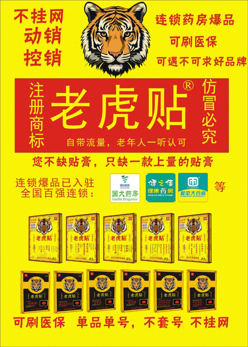 【老虎貼®好商標(biāo)】連鎖爆品可刷醫(yī)保,免費(fèi)試貼,動(dòng)銷,控銷不掛網(wǎng),廣審批文不怕查