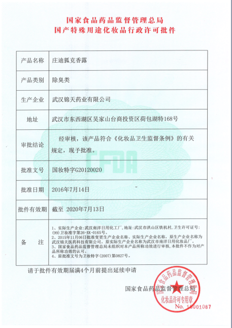 - 國家食藥監(jiān)局國產(chǎn)特殊用途化妝品衛(wèi)生許可批件