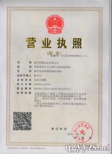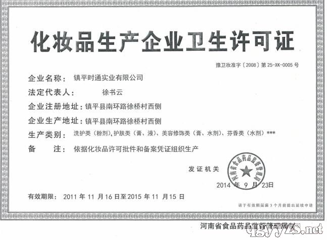 鎮(zhèn)平時(shí)通實(shí)業(yè)有限公司于2007年12月24日在南陽(yáng)市鎮(zhèn)平縣工商行政管理局登記成立,擁有狐臭香體露、靚膚脫毛膏、美乳豐韻霜等國(guó)妝特字批文,蘆薈祛痘凝膠、新靚甲等功能性化妝品備案憑證的專業(yè)生產(chǎn)加工的公司,擁有完整、科學(xué)的質(zhì)量管理體系。鎮(zhèn)平時(shí)通實(shí)業(yè)有限公司的誠(chéng)信、實(shí)力和產(chǎn)品質(zhì)量獲得業(yè)界的認(rèn)可。