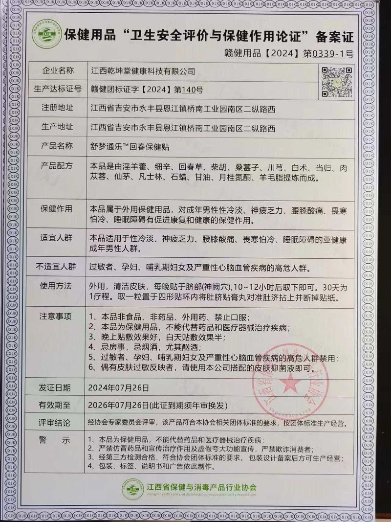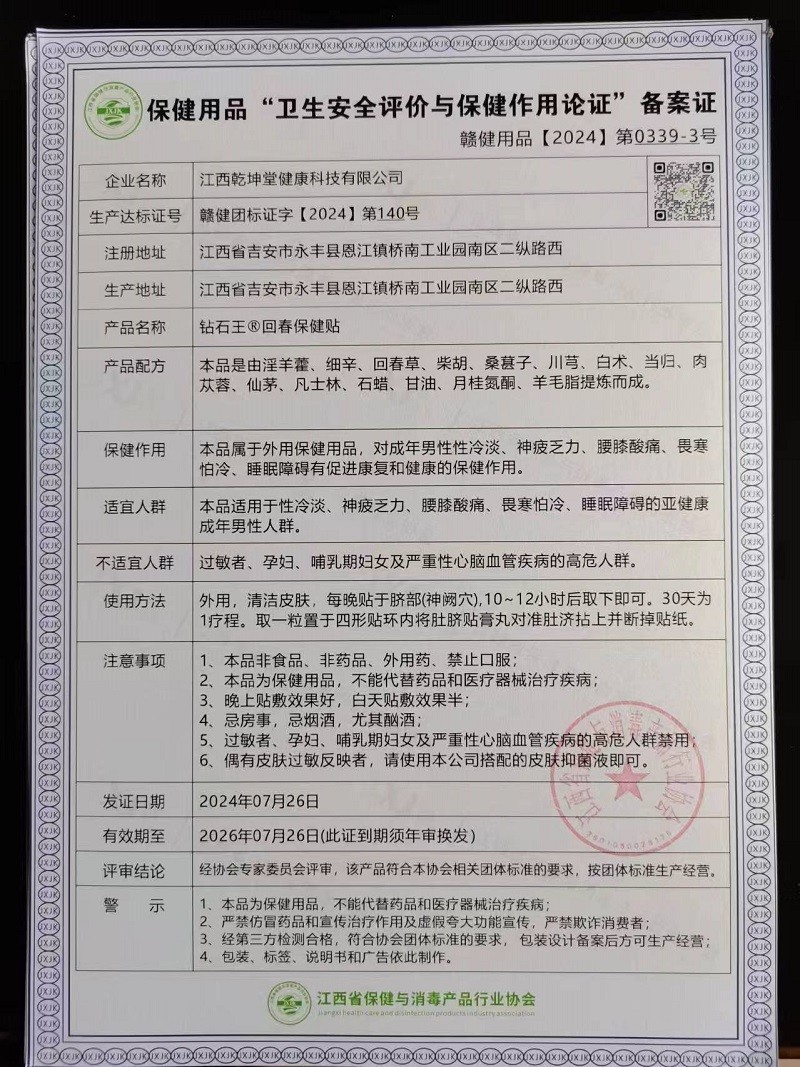 本品對(duì)改善陽(yáng)痿早泄、性功能低下、性欲冷淡(增粗、增硬、延時(shí))神疲乏力、腰膝酸痛、畏寒怕冷、耳聾耳鳴、睡眠障礙等有保健作用。