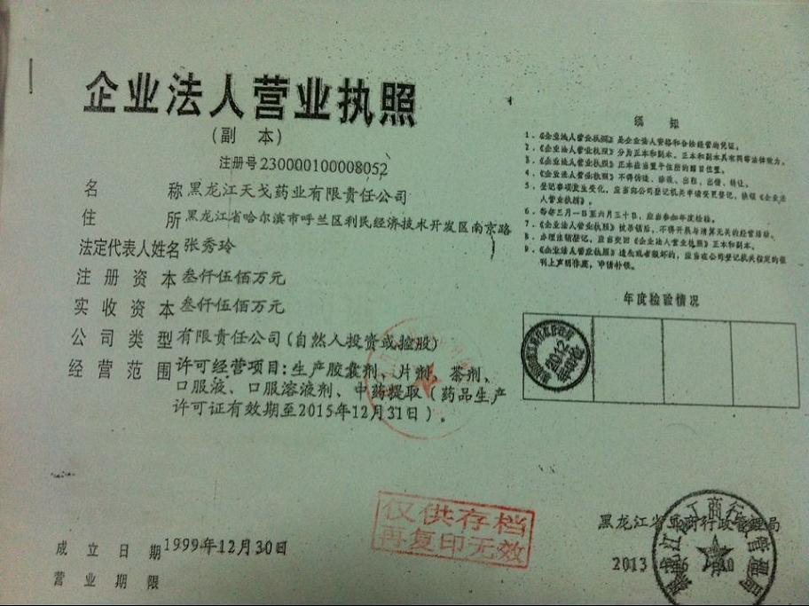 我公司的系列產品,已暢銷全國各地,多年來先后榮獲黑龍江省消費者喜愛產品;哈爾濱市產品;黑龍江醫(yī)藥產品;黑龍江省星火獎;第四屆中國新技術新產品博覽會金獎;全國特色金獎產品;國家星火獎;全國優(yōu)質產品等二十幾項大獎,并在法國巴黎獲得“國際醫(yī)藥、醫(yī)療器械、制藥機械成果博覽會暨學術交流研討會”優(yōu)秀成果金獎和美國東方醫(yī)學會優(yōu)秀中成藥發(fā)明金獎。我廠注冊的“蘭河”牌商標連續(xù)八屆榮獲黑龍江省著名商標。