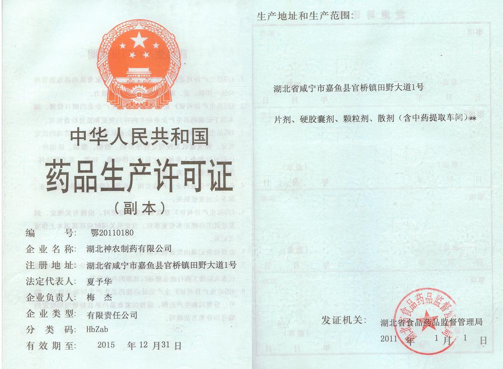 生產(chǎn)范圍: 湖北省嘉魚縣官橋鎮(zhèn)田野大道1號 片劑、硬膠囊劑、顆粒劑、散劑、軟膠囊劑(含中藥提取車間)。***