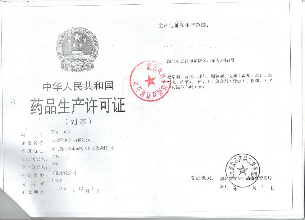 生產(chǎn)范圍: 湖北省武漢市黃陂區(qū)川龍大道特1號(hào) 丸劑、顆粒劑、片劑、栓劑、煎膏劑(膏滋)、糖漿劑、合劑(含中藥提取車間)。***