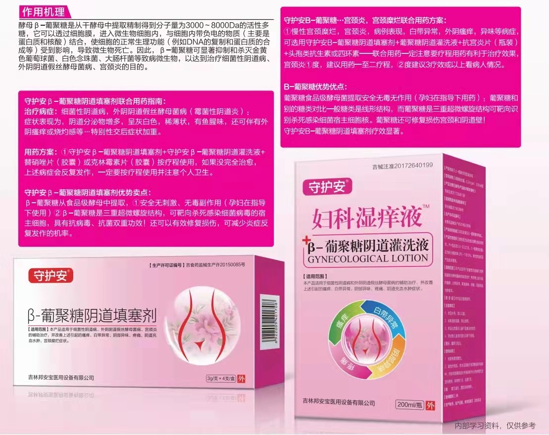 產(chǎn)品用途:適用于細(xì)菌性陰道炎、外陰陰道假絲酵母菌病、慢性宮頸糜爛,宮頸炎,病例表現(xiàn),白帶異常,外陰瘙癢,異味等病癥。葡聚糖還可以修護(hù)損傷宮頸和陰道壁。與守護(hù)安β=葡聚糖陰道填塞劑聯(lián)合用藥使用。