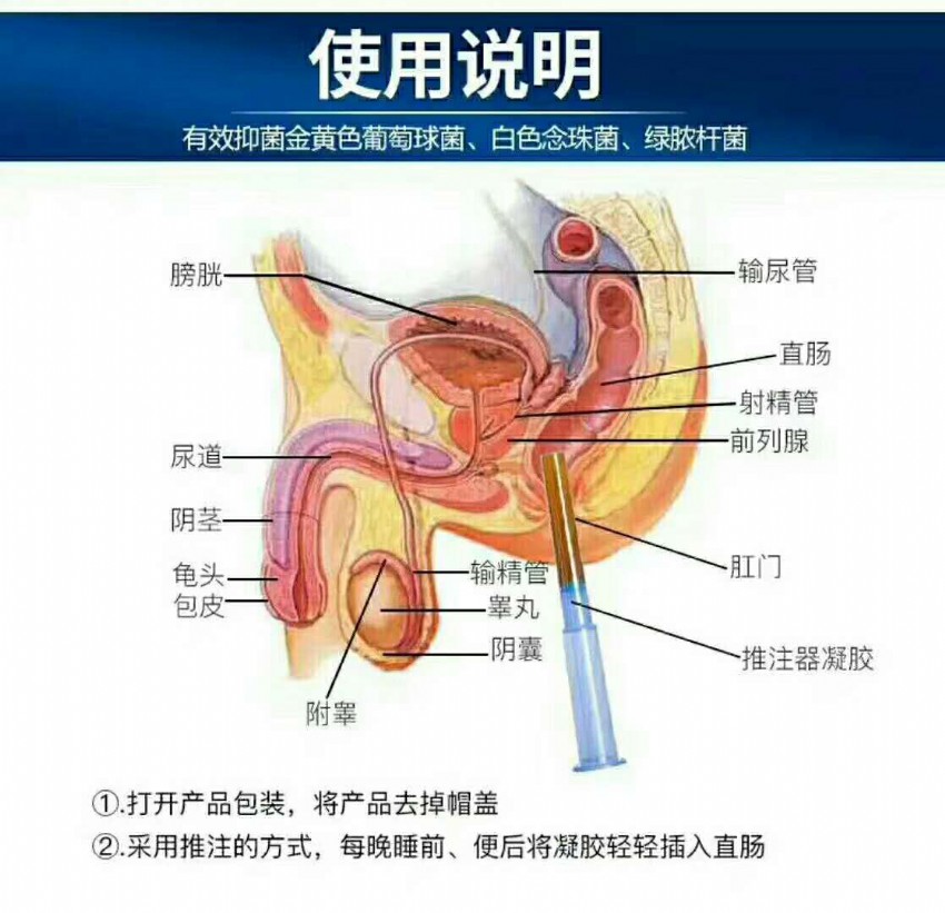 【使用方法】一天1支,15天一療程采用推注給藥方式,每晚睡前,便后,將給凝膠器輕輕插入直腸內(nèi),利用助推干將凝膠推入其中。