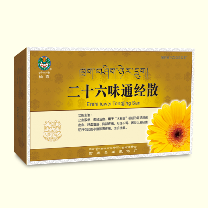 本方是個(gè)大方類方劑,配方復(fù)雜。在二十六味中降香、沙棘膏、藏紫草、紫草茸、藏茜草、鬼箭錦雞兒、山礬葉、兔耳草、巴夏嘎能治血病,散瘀血,調(diào)經(jīng);羚羊角、假耬斗菜、鬼臼能催,治胎盤滯留及月經(jīng)不調(diào)癥;小傘虎耳草(傘梗虎耳草)、紅花、甘青青蘭能活血化瘀,治肝血增盛癥;蒺藜、冬葵果能利尿消腫;訶子、毛訶子、余甘子三味能清熱,和氣血;藏木香、寒水石在本方中能治“木布”病;朱砂、硼砂、火硝、束花報(bào)春在本方中能愈合創(chuàng)傷,止血。全方能止血散瘀,調(diào)經(jīng)活血,對(duì)“木布病”引起的胃腸潰血、肝血增盛、月經(jīng)不調(diào)等癥有良效。