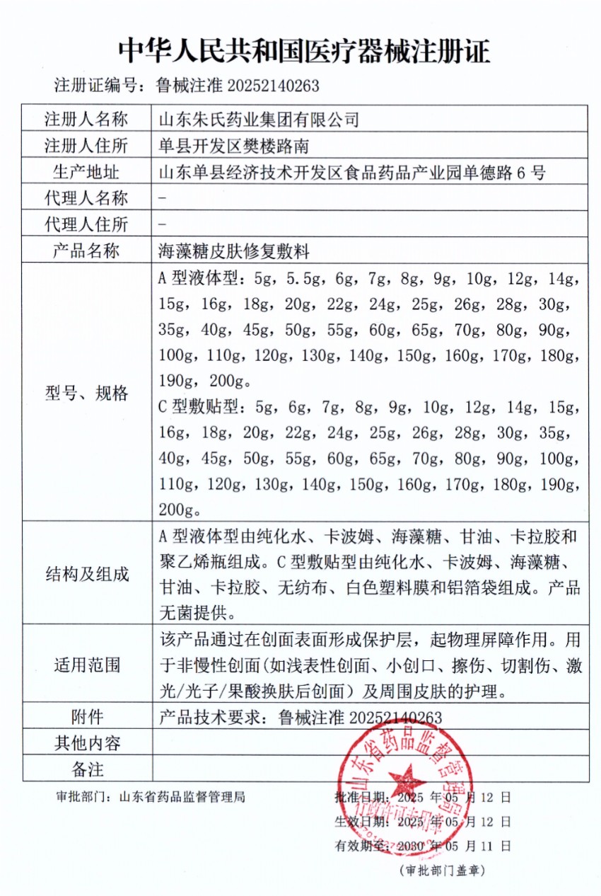 聚焦皮膚修復領域!山東皇圣堂藥業(yè)有限公司醫(yī)用海藻糖皮膚修復敷料拿下醫(yī)療器械注冊證