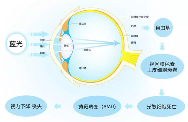 太陽光中的紫外線、電子產(chǎn)品使用不當釋放的高能量藍光等有害光,會穿透透明的角膜、晶狀體、玻璃體,直達黃斑,并與感光細胞發(fā)生光化學反應,形成自由基,進而對細胞產(chǎn)生破壞,引起黃斑氧化,帶來黃斑病變。