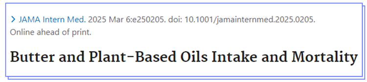 [2]Zhang, Yu et al. “Butter and Plant-Based Oils Intake and Mortality.” JAMA internal medicine, e250205. 6 Mar. 2025, doi:10.1001/jamainternmed.2025.0205