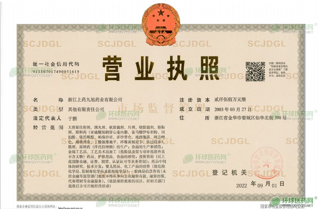 上海醫(yī)藥旗下上海雷允上藥業(yè)有限公司下屬浙江上藥九旭藥業(yè)有限公司,是一家以高新技術(shù)產(chǎn)業(yè)為主的現(xiàn)代化制藥企業(yè),是高新技術(shù)企業(yè)、浙江省專(zhuān)利示范企業(yè)、浙江省綠色生產(chǎn)企業(yè),企業(yè)通過(guò)ISO9001和ISO14001等認(rèn)證。