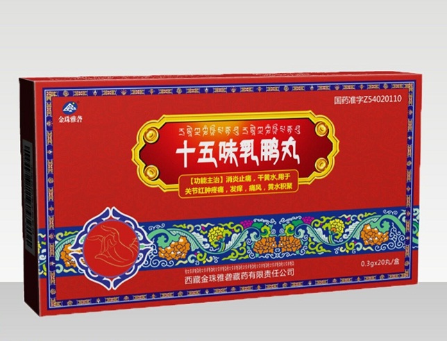 民族藏藥,采用乳香、寬筋藤、決明子、渣馴膏、黃葵子、藏菖蒲、巴夏嘎、兒茶、詞子、安息香、毛訶子、鐵棒錘、木香、人工麝香、余甘子等十幾味地道藏藥材制成。