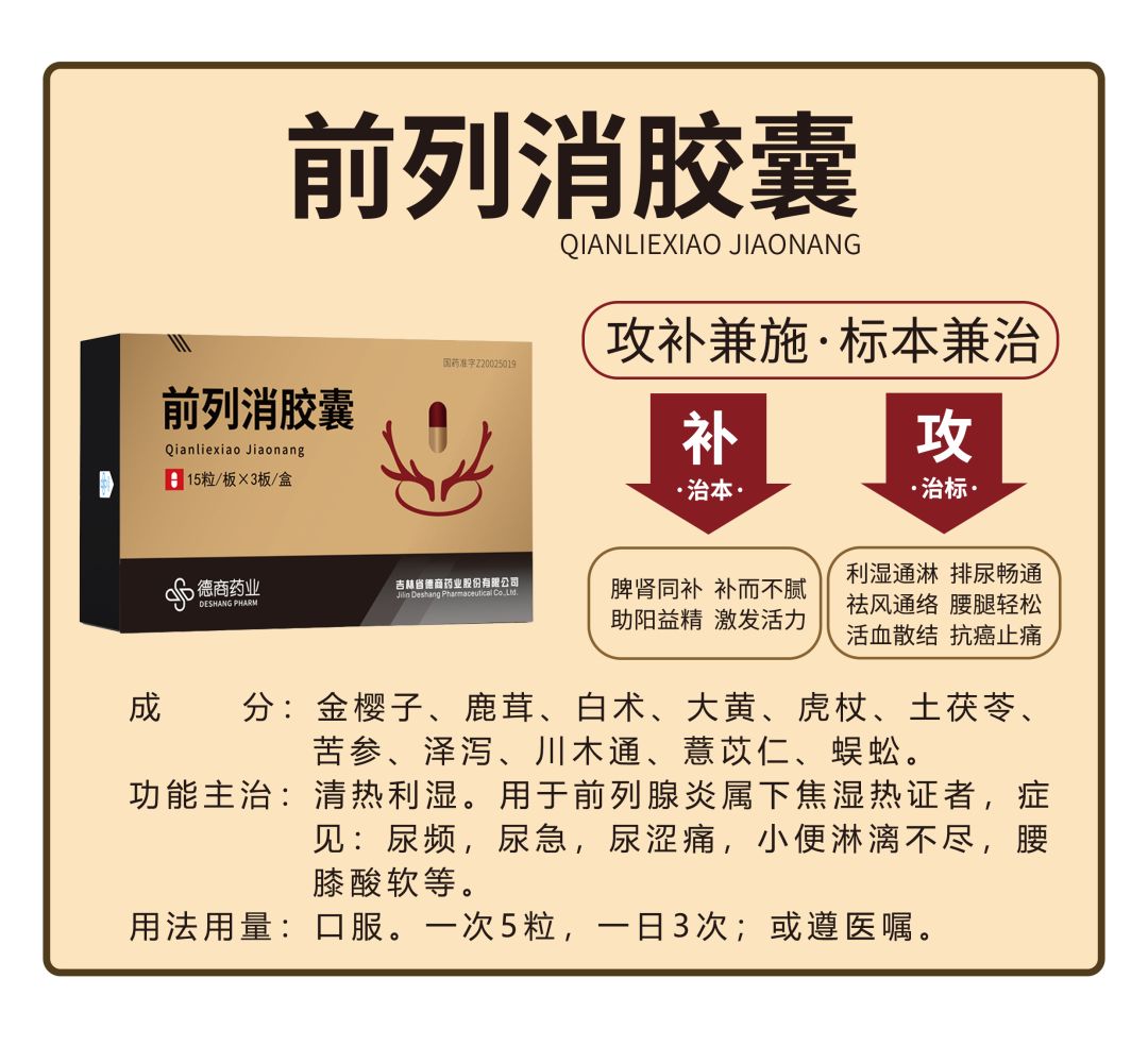 前列腺疾病,作為一種長期威脅男性生殖健康的疾病,需要我們充分的重視。德商藥業(yè)的前列消膠囊,由四大中醫(yī)古方加減化裁而來,包含有鹿茸、金櫻子、虎杖、蜈蚣等多味中藥。在強腎健脾的同時,也具有利濕通淋的功效,真正做到補而不膩,攻補兼施,標(biāo)本兼治。方中使用的鹿茸精選自被譽為“東北三寶”之一的長白山**梅花鹿鹿茸,其具有補精助陽,強筋健骨的功效,是治療男性生殖疾病的**選擇。