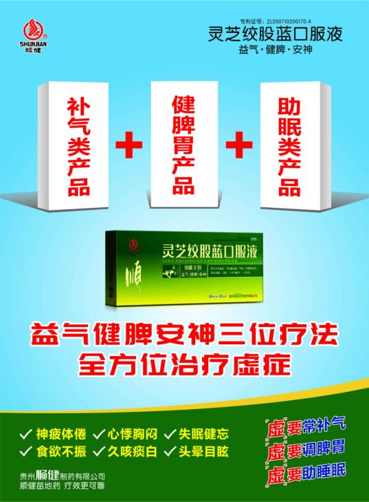 靈芝絞股藍(lán)口服液(國(guó)藥準(zhǔn)字B20020517):益氣,健脾,安神。用于心氣虛癥,可改善心悸,氣短,失眠等癥狀。