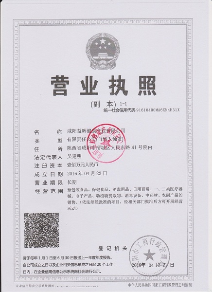 咸陽益輝健康產(chǎn)業(yè)有限公司是一家從事保健食品、功能性食品、健康相關(guān)產(chǎn)品銷售的高新技術(shù)企業(yè),注冊資金100萬,地址位于陜西省咸陽市渭城區(qū),成立日期:2016-04-22,隨著國民經(jīng)濟的發(fā)展,越來越多的人明白保健養(yǎng)生的重要性,行業(yè)前景一片光明,公司現(xiàn)有產(chǎn)品十余種,均受到了廣大消費者的歡迎。