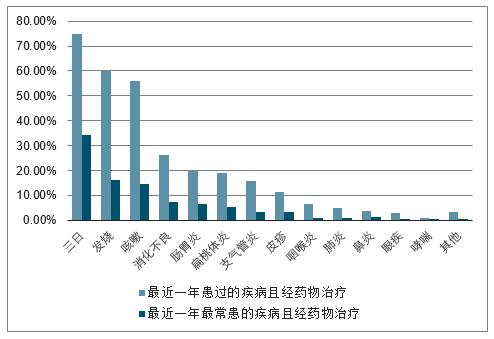 兒童患病率較高的疾病主要是呼吸系統(tǒng)疾病和消化系統(tǒng)疾病。統(tǒng)計數(shù)據(jù)顯示,2016年我國0-14歲兒童患者群體中,兒童有進(jìn)行藥物治療的疾病患病率前五名分別為感冒(74.7%)、發(fā)燒(59.8%)、咳嗽(56.0%)、消化不良(26.1%)和腸胃炎(19.9%)。