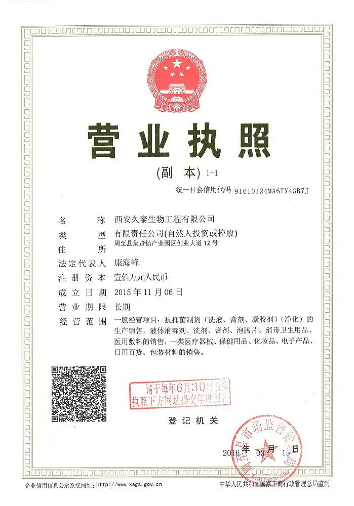 西安久泰生物工程有限公司地處西安周至健康產(chǎn)業(yè)園,占地八十余畝,擁有員工200余人,管理人員30余名,是西安多家醫(yī)藥保健品企業(yè)并購重組后成立的全新健康企業(yè),是陜西省保健用品生產(chǎn)基地,是西安市政府重點(diǎn)扶持企業(yè)。