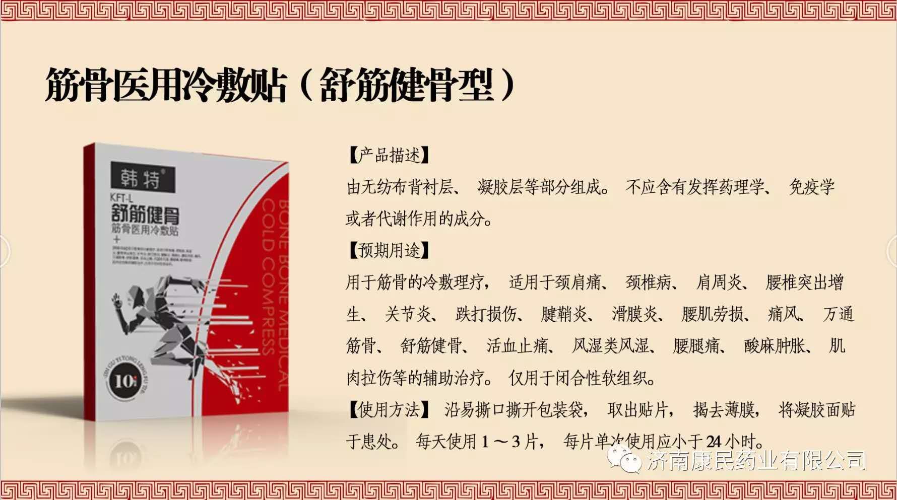 上述有提到舒筋健骨型醫(yī)用冷敷貼,這款產(chǎn)品是我們山東朱氏藥業(yè)集團(tuán)有限公司生產(chǎn)的,這款產(chǎn)品 透皮綠色療法,以理法方藥為依據(jù),通過載體貼敷在相應(yīng)的穴位上,在藥物和載體的雙重作用下; 優(yōu)點(diǎn)是可以不經(jīng)消化道。