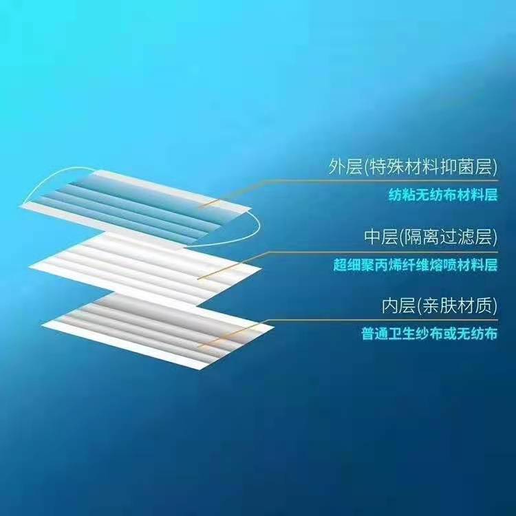 醫(yī)用外科口罩采購-口罩哪個牌子好?東貝品牌醫(yī)用外科口罩面體分為內(nèi)、中、外三層,內(nèi)層為親膚材質(zhì)(普通衛(wèi)生紗布或無紡布),中層為隔離過濾層(超細(xì)聚丙烯纖維熔噴材料層),外層為特殊材料抑菌層(紡粘無紡布材料層)。