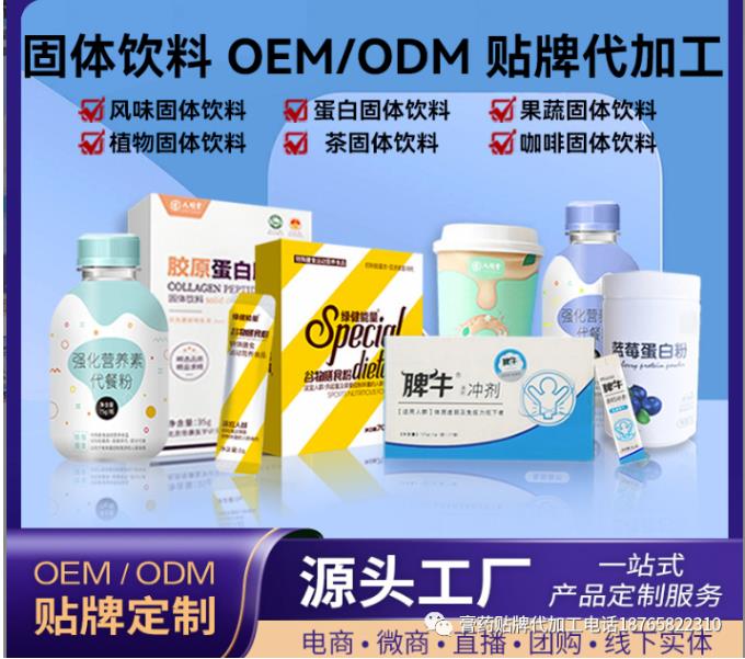 固體飲料貼牌代工廠家電話:18765822310(同號),我們這邊是固體飲料、風味飲料、代餐粉、代餐奶昔、益生菌等保健食品貼牌代加工廠家,如果有想做功能食品的代工的朋友歡迎來電咨詢討論。