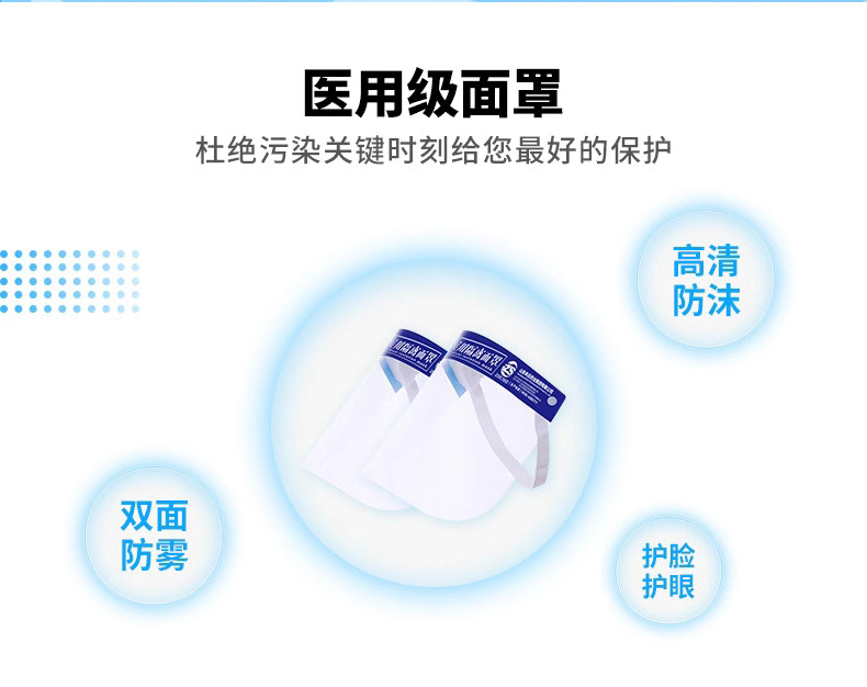 產(chǎn)品用途:用于醫(yī)療機(jī)構(gòu)中檢查治療時(shí)起防護(hù)作用,雙層高透防霧阻隔體液、血液飛濺或潑濺。