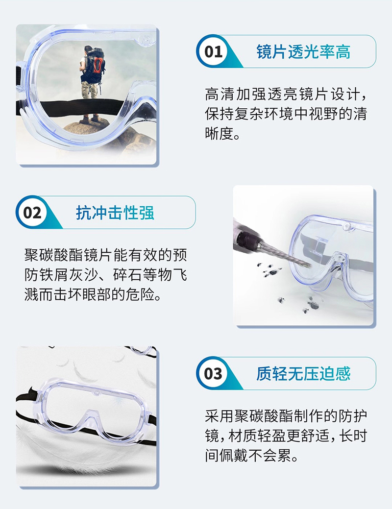 三、質(zhì)輕無壓迫感:采用聚碳酸酯制作的防護鏡,材質(zhì)輕盈更舒適,長時間佩戴不會累。