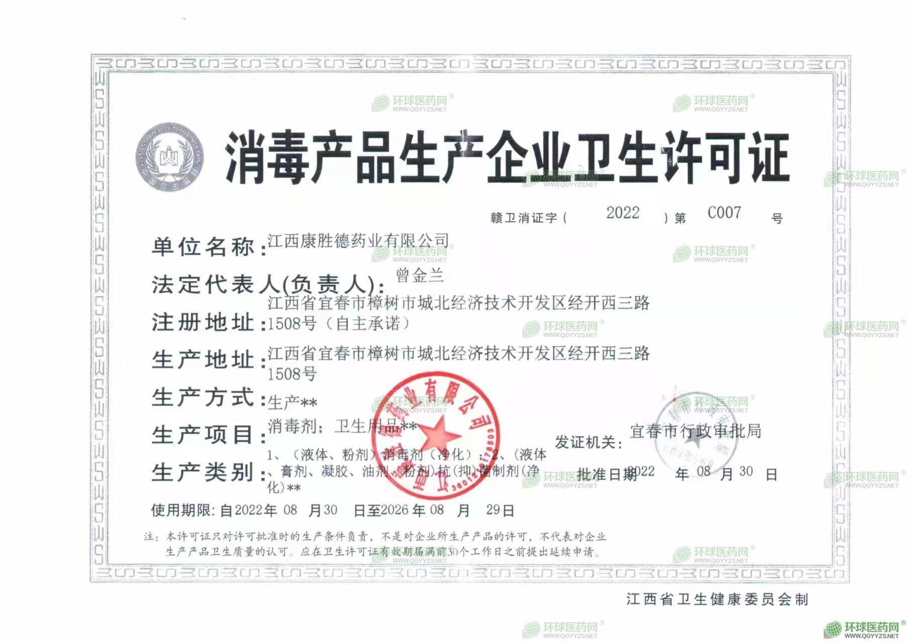 - 消毒產(chǎn)品生產(chǎn)企業(yè)衛(wèi)生許可證