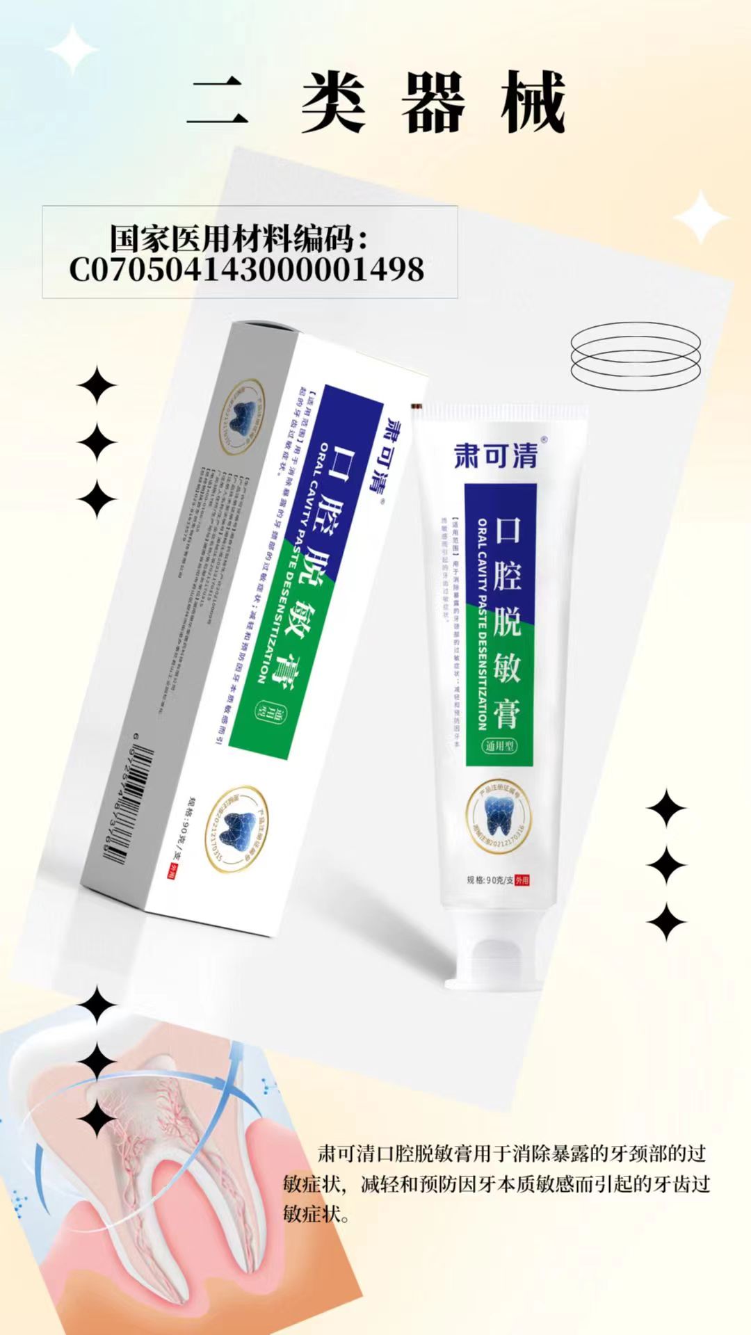 【適用范圍】用于消除暴露的牙頸部的過敏癥狀;減輕和預(yù)防因牙本質(zhì)敏感而引起的牙齒過敏癥狀。