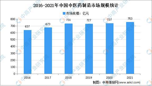 當下中醫(yī)藥市場規(guī)模呈現(xiàn)穩(wěn)步增長的狀態(tài),我國中藥制造市場從2016年637億元增至2020年737億元,年均復(fù)合增長率為3.7%。2021年我國中藥制藥市場規(guī)模達到753億元,呈上升趨勢。