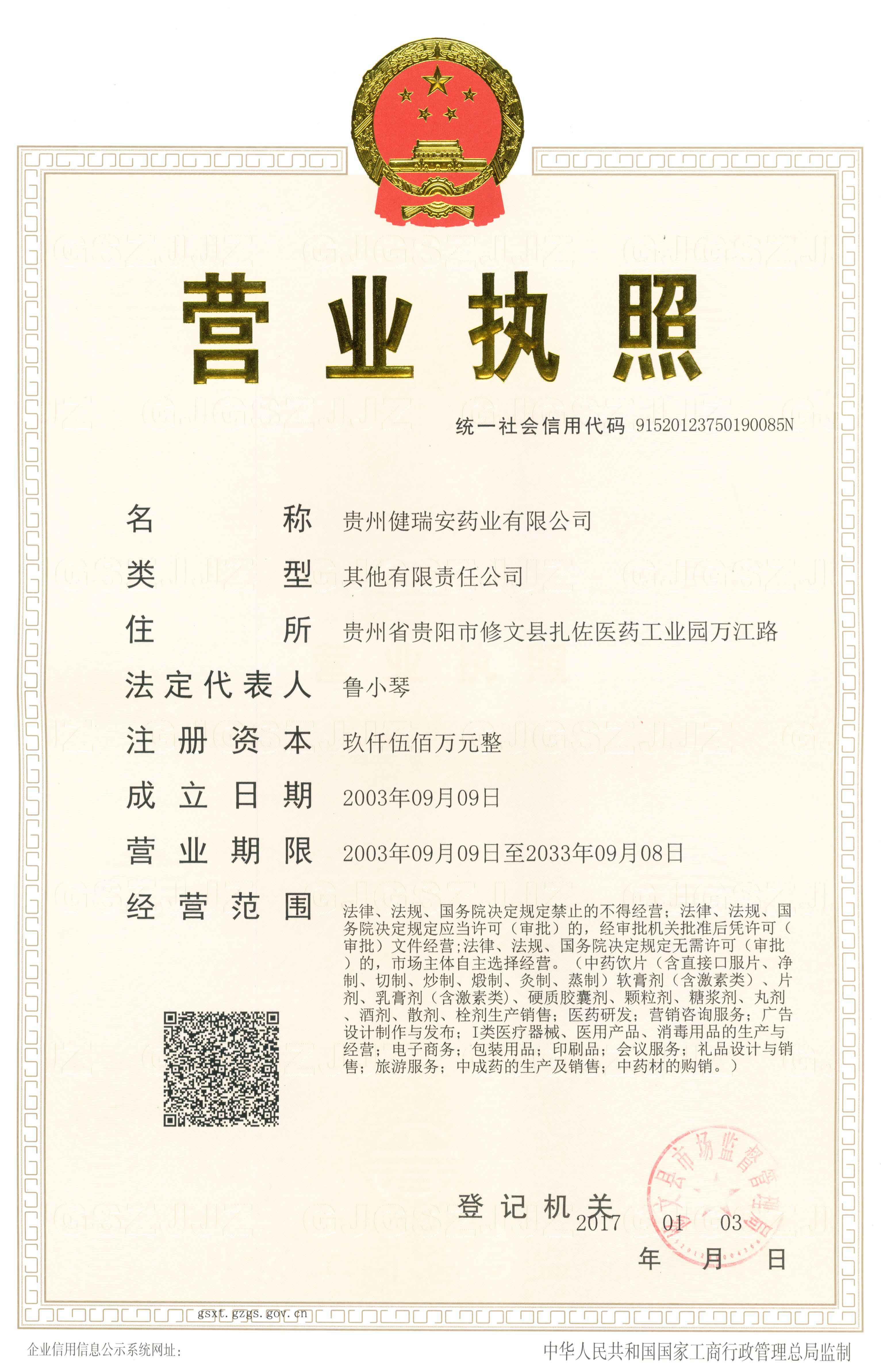 貴州健瑞安藥業(yè)有限公司是由海南伊順?biāo)帢I(yè)有限公司于2016年5月通過全資收購(gòu)原“貴陽(yáng)大漢制藥有限公司”而成立的一家集中醫(yī)藥技術(shù)研發(fā)、生產(chǎn)、銷售于一體的高科技藥品生產(chǎn)企業(yè)。健瑞安公司位于貴陽(yáng)市修文縣扎佐醫(yī)藥工業(yè)園萬(wàn)江路,占地面積46005平方米,一期建筑面積為3萬(wàn)平方米。其中綠化面積占總面積的50%,注冊(cè)資金9500萬(wàn)元,主營(yíng):藥品、中藥提取物、保健食品、天然化妝品、醫(yī)療用品的開發(fā)、生產(chǎn)及銷售,年產(chǎn)值5億元。