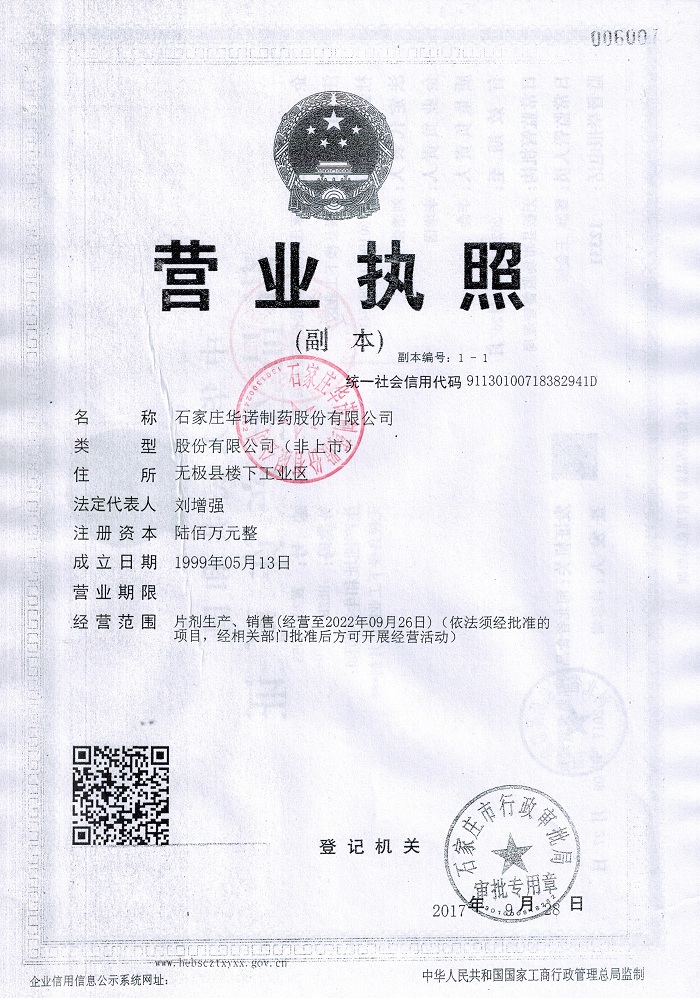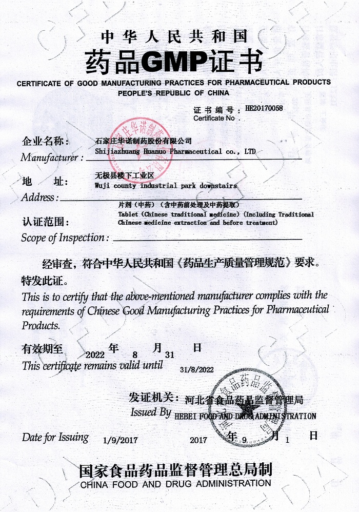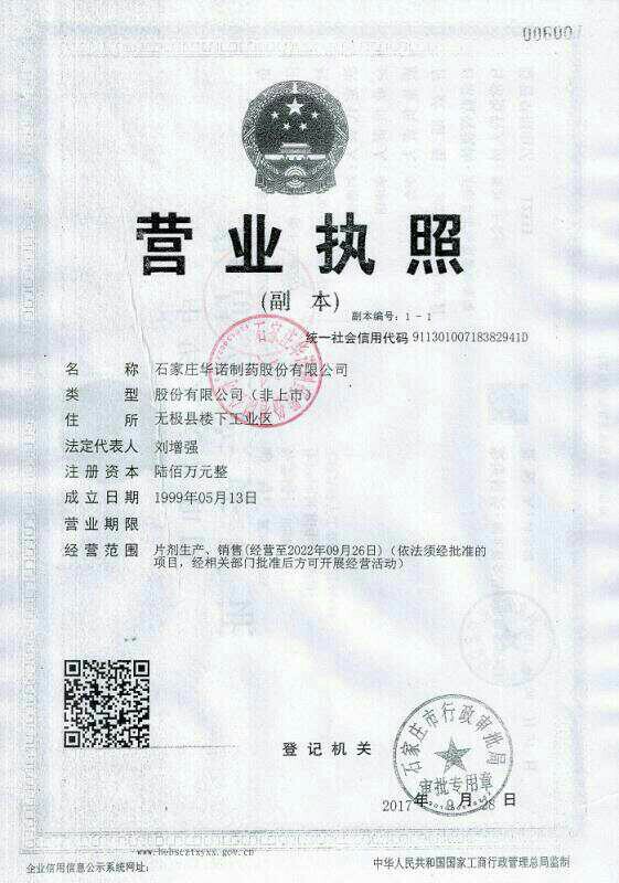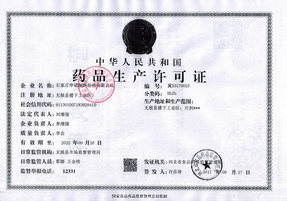 石家莊華諾制藥股份有限公司成立于一九九九年,經(jīng)過(guò)十幾年的發(fā)展,現(xiàn)已成為具有相當(dāng)規(guī)模的股份制現(xiàn)代化制藥企業(yè)。2017年通過(guò)了國(guó)家食品藥品監(jiān)督管理局GMP四次認(rèn)證。