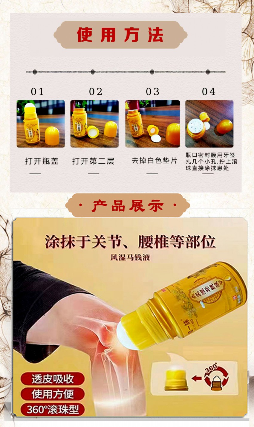 無(wú)論您是風(fēng)濕關(guān)節(jié)痛 ,頸椎病,肩周炎,痛經(jīng)宮寒,抽筋骨刺,坐骨神經(jīng)痛,腰間盤(pán)突出,以及酸、脹、麻、木等無(wú)論您是什么年齡,都可以使用我們的呂一抹風(fēng)濕馬錢(qián)液來(lái)緩解疼痛,緩決困擾你的難題!