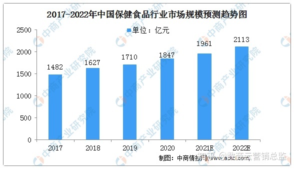 據(jù)統(tǒng)計數(shù)據(jù)顯示,中國保健食品行業(yè)市場規(guī)模增長穩(wěn)定,從2017年的1482億元增長至2020年的1847億元,年均復(fù)合增長率達7.75%。根據(jù)我國經(jīng)濟發(fā)展?fàn)顩r,以及行業(yè)發(fā)展趨勢,預(yù)計2022年中國保健食品行業(yè)市場規(guī)模將超過2000億元。