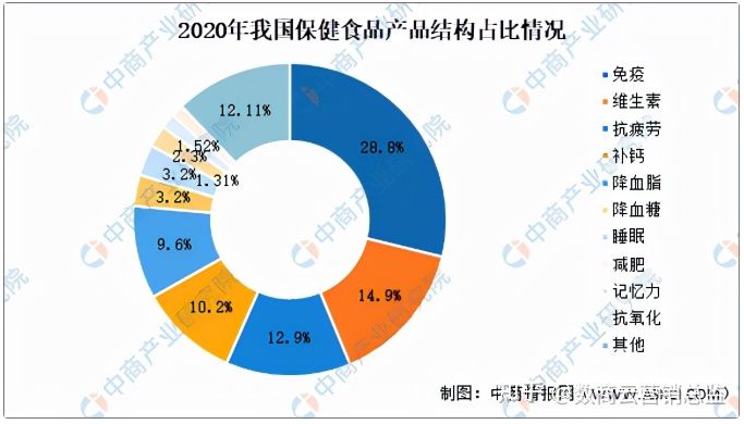 2016年7月1日起,《保健食品注冊與備案管理辦法》正式開始實施,保健食品行業(yè)正式步入“注冊制”與“備案制”雙軌并行時代。截至2020年2月底,我國保健食品批文總數(shù)達到16535個,其中國產(chǎn)保健食品滋補品為15752個,進口保健食品滋補品為783個。目前我國市面上比較熱門的保健食品保健功能主要集中在調(diào)節(jié)免疫,占28.8%。其次為維生素(14.9%)、抗疲勞(12.9%)及補鈣(10.2%)等。(此數(shù)據(jù)來源于知乎)