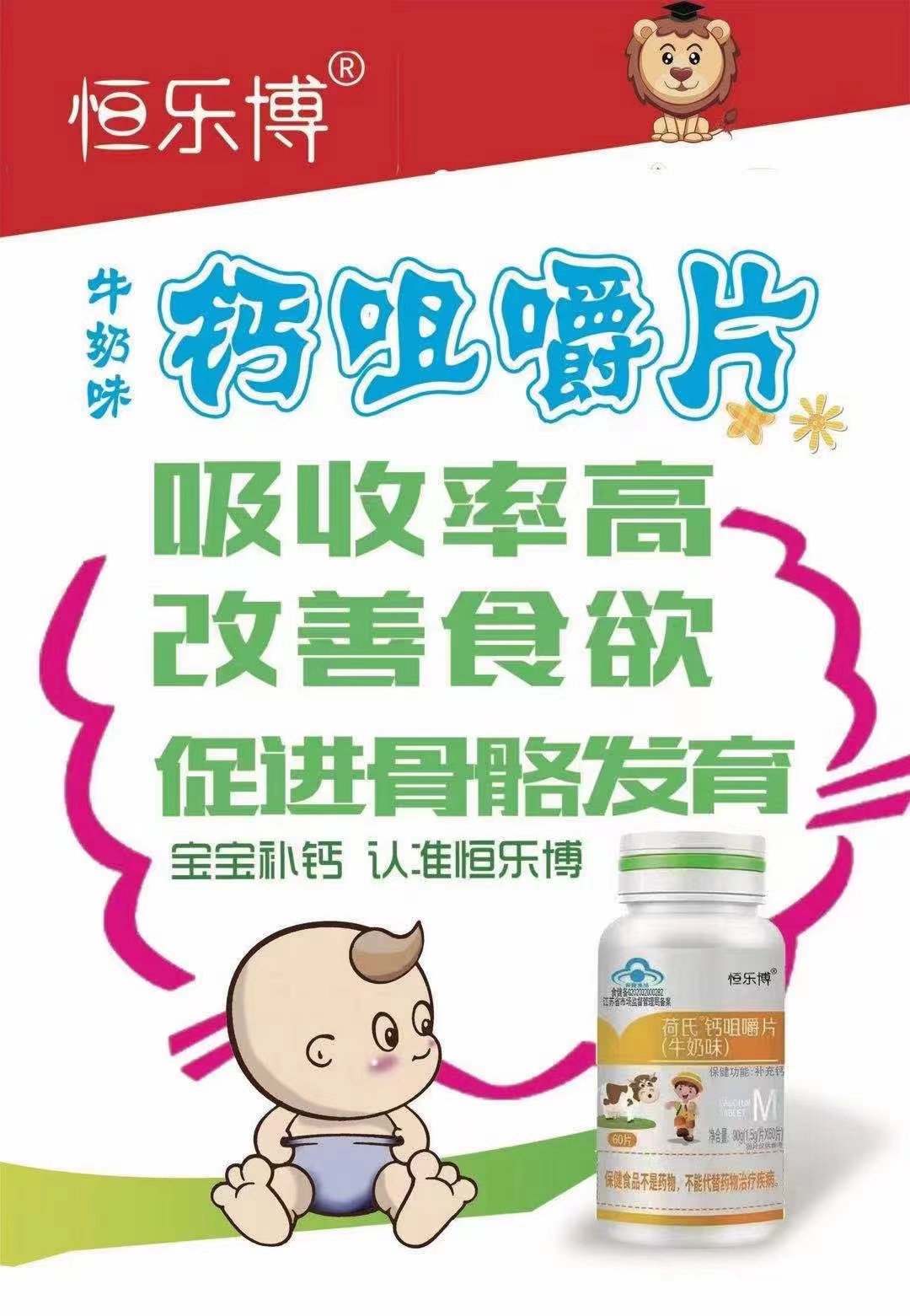 本品以碳酸鈣,乳粉,麥芽糊精,山梨糖醇,硬脂酸鎂,食用鹽,牛奶香精為主要原料制成的保健食品,具有補充鈣的保健功能。