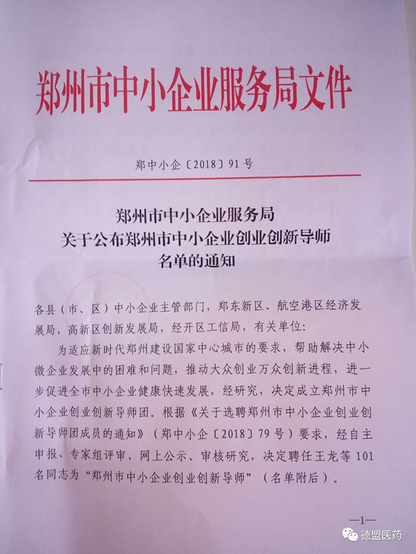 為加強(qiáng)鄭州市中小企業(yè)創(chuàng)業(yè)創(chuàng)新導(dǎo)師團(tuán)的管理服務(wù),充分利用好中小企業(yè)創(chuàng)業(yè)創(chuàng)新導(dǎo)師資源,廣泛開(kāi)展導(dǎo)師進(jìn)園區(qū)、進(jìn)平臺(tái)、進(jìn)基地公益性巡回服務(wù)活動(dòng),為中小企業(yè)創(chuàng)業(yè)創(chuàng)新提供優(yōu)質(zhì)專業(yè)服務(wù)。中小企業(yè)創(chuàng)業(yè)創(chuàng)新導(dǎo)師要樹(shù)立服務(wù)思想,發(fā)揚(yáng)導(dǎo)師精神,奉獻(xiàn)智慧熱情,傳播創(chuàng)業(yè)創(chuàng)新技能,激發(fā)中小企業(yè)創(chuàng)業(yè)創(chuàng)新內(nèi)生動(dòng)力,為推動(dòng)新時(shí)代全市中小企業(yè)高質(zhì)量發(fā)展做出貢獻(xiàn)。近日,鄭州市中小企業(yè)服務(wù)局,經(jīng)研究,決定成立鄭州市中小企業(yè)創(chuàng)業(yè)創(chuàng)新導(dǎo)師團(tuán)。根據(jù)《關(guān)于選聘鄭州市中小企業(yè)創(chuàng)業(yè)創(chuàng)新導(dǎo)師團(tuán)成員的通知》(鄭中小企〔2018〕79號(hào))要求,經(jīng)自主申報(bào)、專家組評(píng)審、網(wǎng)上公示、審核研究,決定聘任王龍等101名同志。河南德盟醫(yī)藥科技有限公司銷售總監(jiān)楊瀾被評(píng)為“鄭州市中小企業(yè)創(chuàng)業(yè)創(chuàng)新導(dǎo)師”。