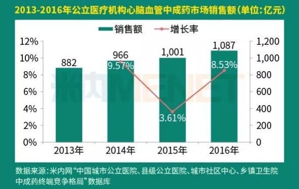 近年來,心腦血管疾病發(fā)病率高居不下,特別是中老年人,每年都患病人數都在緩步增長。根據國家心血管病中心在2017年發(fā)布的《中國心血管病報告2016》中顯示,現有心血管病患病人數約2.9億人,且死亡率高于腫瘤和其他疾病。故而心腦血管用藥市場也愈加龐大,在2016年中,公立醫(yī)療機構終端心腦血管中成藥銷售額達到了1087億元。