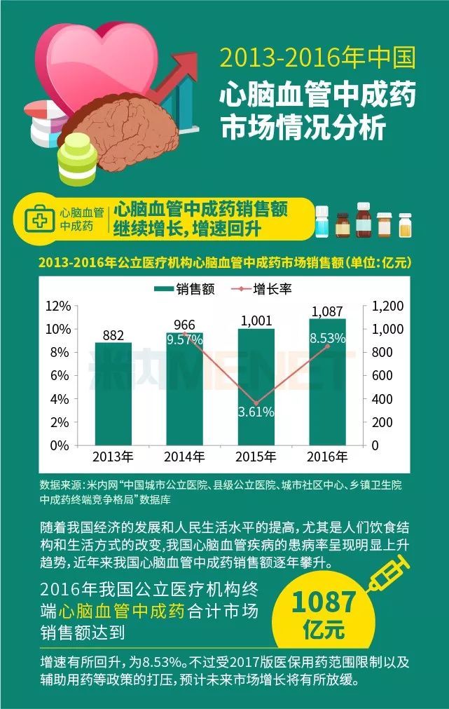 心腦血管疾病的高發(fā)也讓心腦血管用藥市場逐年擴增,根據調查顯示,2016年我國心腦血管疾病中成藥總銷售額為1087億元,是名副其實的千億市場,其中的商機無限,不可小覷。