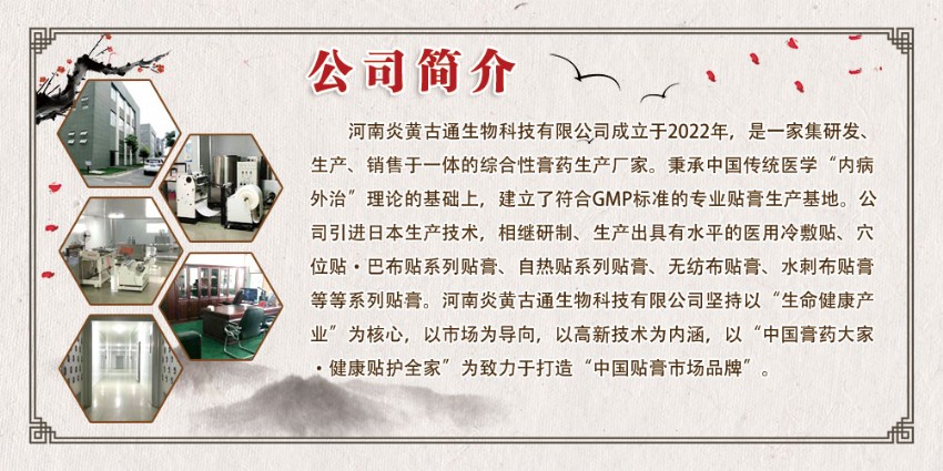 在快節(jié)奏的現(xiàn)代生活中,頸肩腰腿痛、日常小傷痛、肌膚不適等問題時常困擾著人們。傳承中國傳統(tǒng)醫(yī)學(xué)智慧,融合現(xiàn)代科技力量,河南炎黃古通生物科技有限公司應(yīng)運而生,以 “中國膏藥大家,健康貼護全家” 為理念,深耕健康產(chǎn)業(yè),為大眾帶來多系列高品質(zhì)貼膏及護理產(chǎn)品,成為值得信賴的健康守護者。