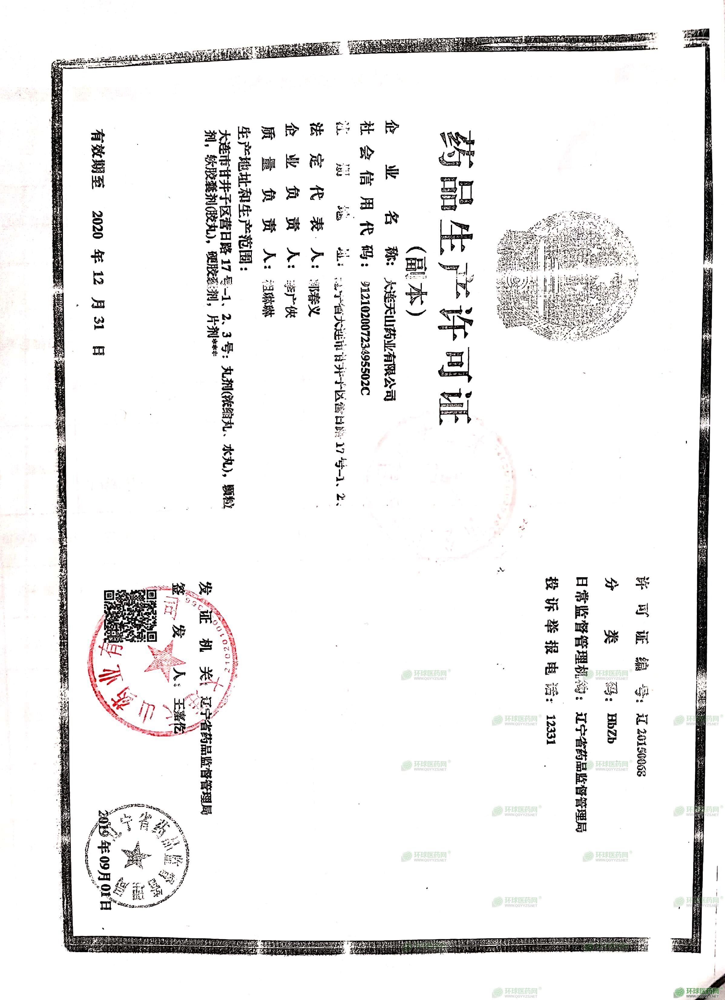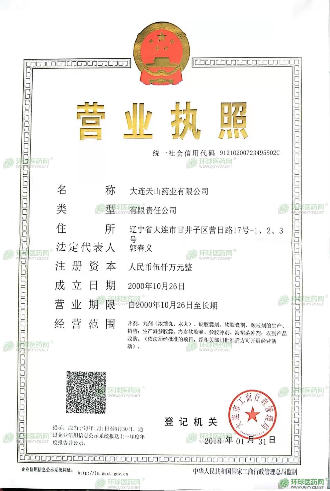 大連天山藥業(yè)有限公司成立于2000年10月26日,注冊(cè)地位于遼寧省大連市甘井子區(qū)營(yíng)日路17號(hào)-1、2、3號(hào),法人代表為郭春義。經(jīng)營(yíng)范圍包括片劑、丸劑(濃縮丸、水丸)、硬膠囊劑、軟膠囊劑、顆粒劑的生產(chǎn)、銷(xiāo)售;生產(chǎn)海參膠囊、海參軟膠囊、參膠沖劑、海裙菜沖劑;農(nóng)副產(chǎn)品收購(gòu)。(依法須經(jīng)批準(zhǔn)的項(xiàng)目,經(jīng)相關(guān)部門(mén)批準(zhǔn)后方可開(kāi)展經(jīng)營(yíng)活動(dòng)。)